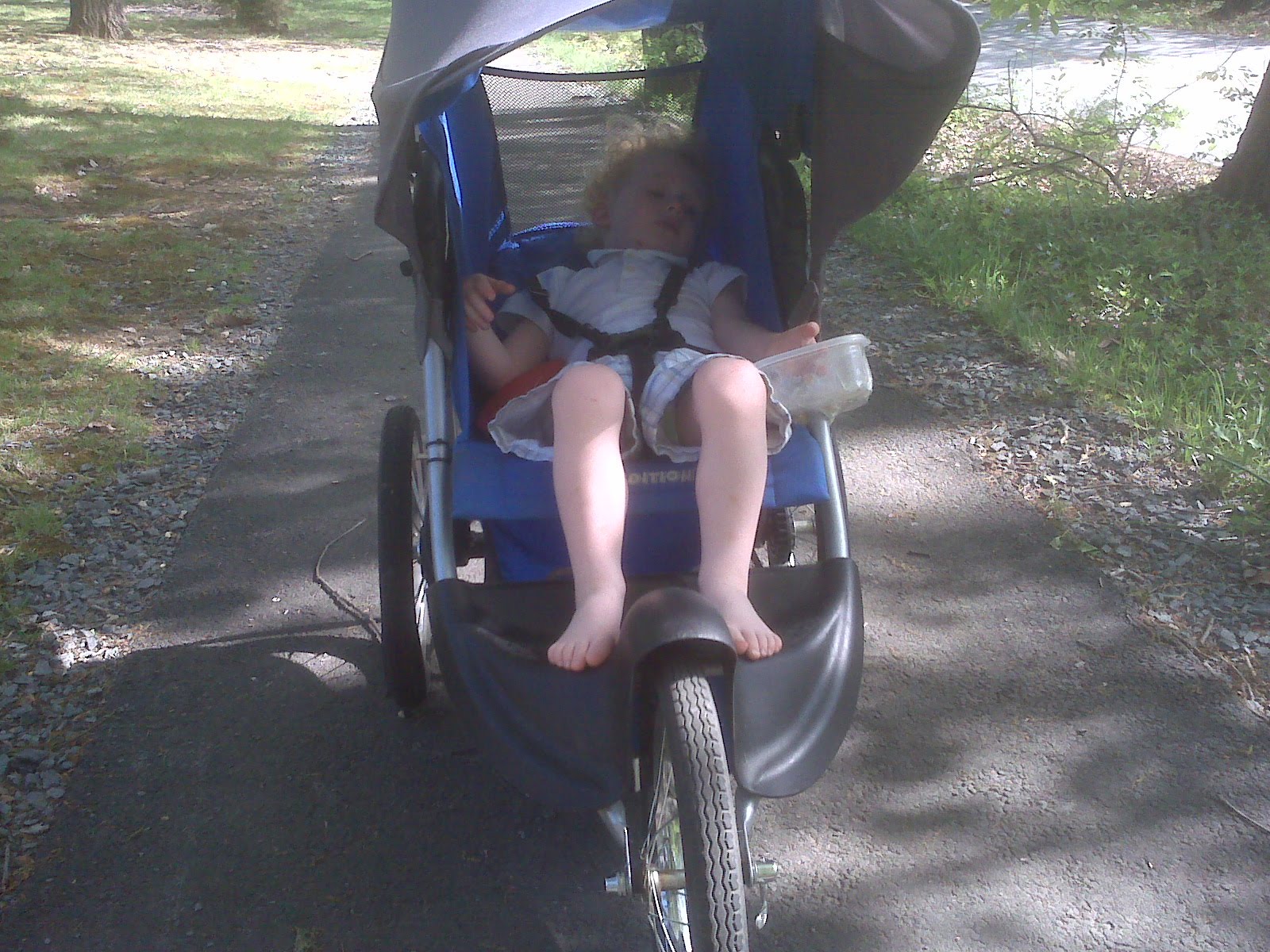 Ian and I took a walk to the store after nap today. (Okay, I walked, he rode.) Most notable features of today’s walk were the altercation between two motorists (they taught Ian a new word… “F***er!” Then Mommy said, “Ian, you didn’t hear that. She’s right, but you didn’t hear it.”) and the unusual number of serious cyclists we saw today. Lots of them were sporting logos from their sponsors… either they are just enjoying the nice weather like us, or there’s an event on the horizon and they’re training.