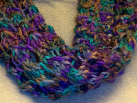 What have I been knitting, you ask? How kind of you to wonder. Why, one of Elizabeth Zimmerman’s Moebius cowls in some yummy alpaca! Perfect for mommy because there are no hard edges to get in the way at snuggle time, it’s warm and soft and best of all, no loose ends to tug it off with.