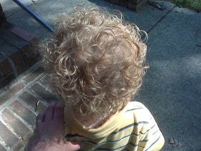 Resist though I might, it had to happen sooner or later. The onset of hot weather forced my hand, since every time Ian would get hot and sweaty, his longest curls would get very badly tangled and no one was enjoying the combing-out process. So Mommy’s Barber Shop opened for business today and trimmed Ian’s topknot. Mommy survived. Ian could care less.