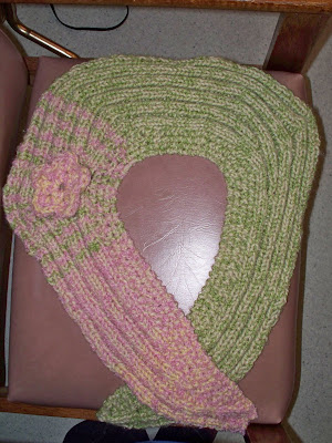 This is the “shawlette” I made for my Grandma after they lost hers in the laundry at the nursing home. (It’s a wonderful facility, btw.) I did not make any notes because I have no intention of making another, but I held two strands of acrylic (wouldn’t want the institutional laundry to boil a nice wool, now) together to make it work up faster… one novelty and one worsted. The second skein of green turned out to exist only in my head, which is why you see it switch to pink…The body of the piece is worked in 2 & 2 rib and bordered on the neck side with moss stitch. I shaped everything with short rows and by increasing/decreasing to add/remove ribs as needed. And the flower? Well, now… that’s just what we do when there’s a spectacular decrease error right at the shoulder.