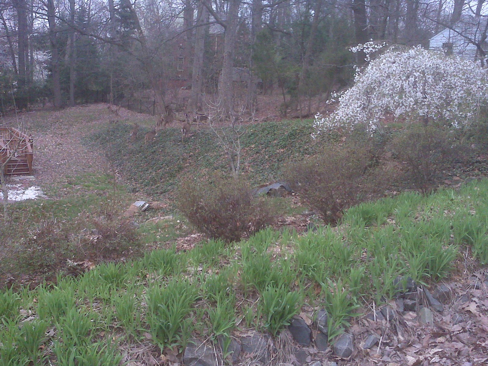 Here’s a shot from my solo walk. It’s a little hard to make out because of the resolution, but there are about a dozen deer feasting on my neighbor’s front yard: